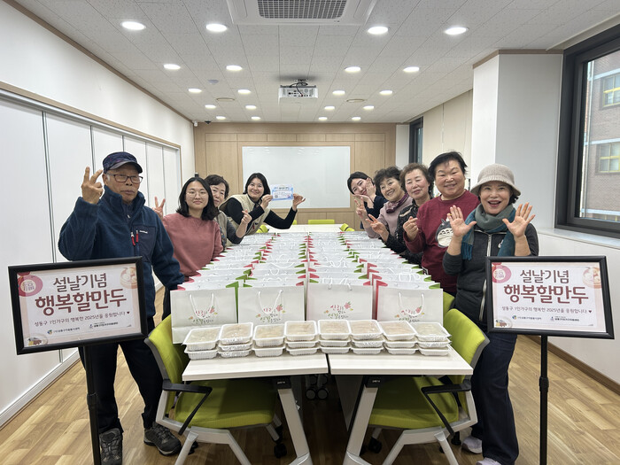 | ▲ 센터 관계자들이 명절 전 직접 빚은 손만두 나눔 프로그램에 참석해 기념 촬영을 하고 있다. (사진=성동구청 제공) |