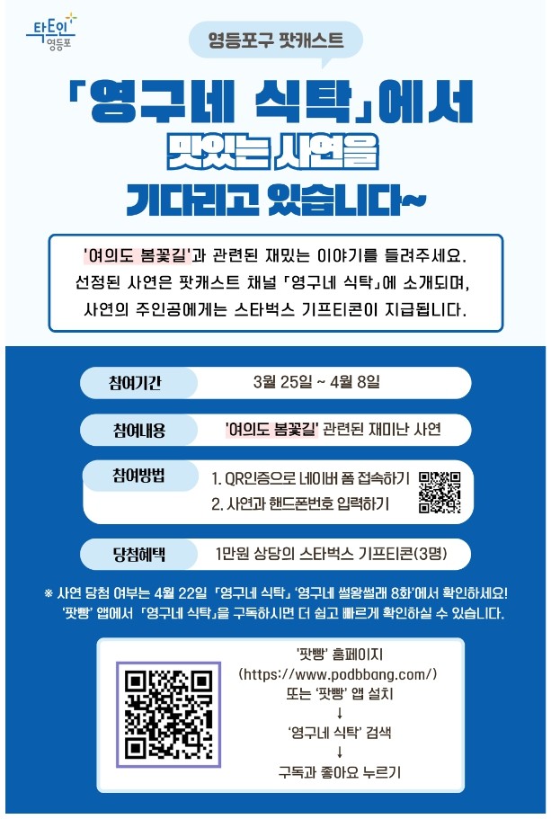 [시민일보 = 여영준 기자] 서울 영등포구(구청장 채현일)는 인터넷 라디오 플랫폼인 팟캐스트 '영구네 식탁'에서 오는 8일까지 구민 사연을 모집한다고 밝혔다.