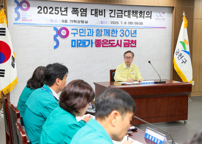 [시민일보 = 여영준 기자] 금천구(구청장 유성훈)는 지난 7일 오전 10시 서울 전역에 첫 폭염경보가 발령됨에 따라 8일 오전 9시 유성훈 금천구청장 주재로 행정안전국장, 복지가족국장, 관련부서장 10명과 함께 폭염 대비 긴급대책회의를 개최했다.