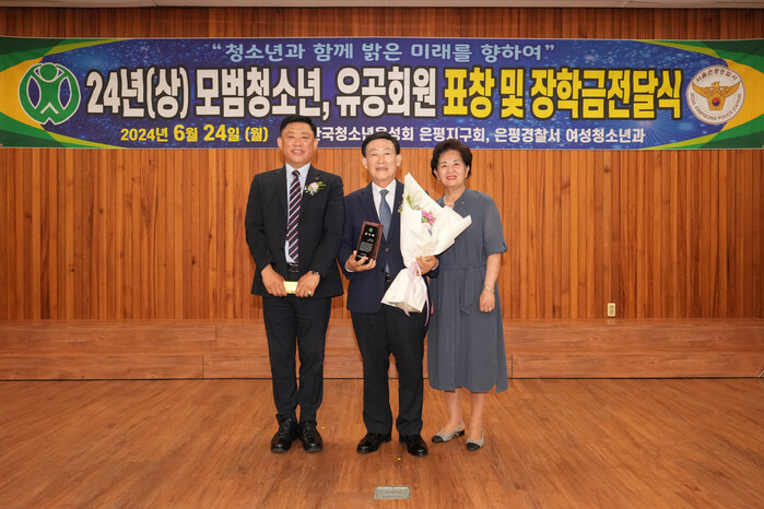 [시민일보 = 이대우 기자] 기노만 서울 은평구의회 의장이 최근 24일 은평경찰서 4층 대강당에서 진행된 “2024년 상반기 모범청소년·유공회원 표창 및 장학금 전달식”에서 한국청소년육성회 은평지구회(회장 김호승) 감사패를 받았다.