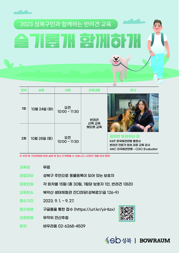 [시민일보 = 홍덕표 기자] 성북구(구청장 이승로)가 오는 10월24일과 28일 전문 훈련사가 함께하는 반려견 산책 교육을 운영한다.