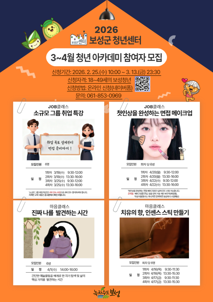 이번 프로그램은 취업 역량 강화와 마음 치유를 주제로 총 4개 과정으로 운영되며, 이달부터 4월까지 보성군 청년센터에서 진행된다.