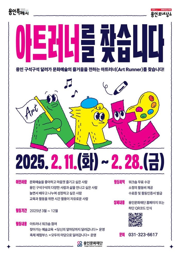 문화예술을 좋아하고 예술의 가치를 전하고 싶은 용인시민이라면 누구나 지원 가능한 이번 ‘아트러너’ 모집은 오는 2월 11일부터 28일까지 용인문화재단 홈페이지 공지사항을 통해 신청할 수 있다.