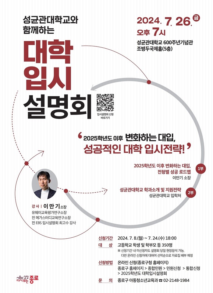 수험생과 학부모뿐 아니라 관심 있는 주민 누구나 종로구 누리집에서 8일부터 참여 신청하면 된다. 종로구는 온라인 사전 신청자에 한해 설명회 당일 선착순으로 자료집을 제공한다. 당일 현장 참여도 가능하다.