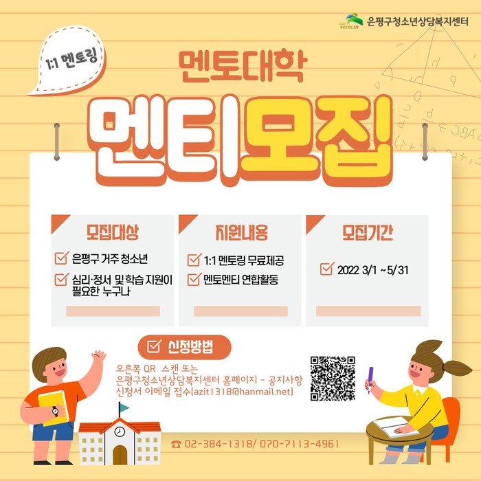 ‘멘토대학’은 학습 문제와 등교 제한으로 또래 관계에 어려움을 겪고 있는 청소년에 심리정서와 학습 지원, 1:1 맞춤 멘토링을 제공하는 프로그램이다. 프로그램은 은평구 청소년상담복지센터에서 운영하며, 청소년 상담에 관심 있는 대학(원)생과 일반인이 멘토에 나선다.