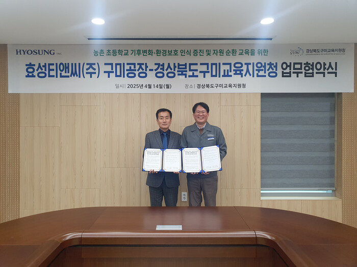 효성티앤씨는 경북 구미교육지원청과 구미 지역 농촌 초등학생 대상 환경교육 활성화를 위한 업무협약(MOU)을 체결했다고 15일 밝혔다.