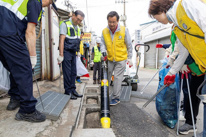 | ▲ 5월 자원봉사day 활동을 통해 홍수 대비 빗물받이 청소를 하고 있는 최호권 구청장. (사진=영등포구청 제공) |