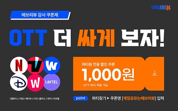 대상 고객은 원하는 OTT 파티를 찾을 때, 할인코드명에 '계정공유는에브리뷰’를 입력하면 할인이 적용되어 결제금액에서 1,000원을 할인 받을 수 있다.