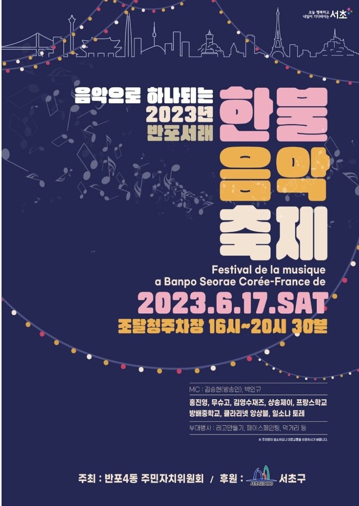 [시민일보 = 이대우 기자] 서울 서초구(구청장 전성수)가 오는 17일 서래마을 인근 서울지방조달청 주차장에서 2023 ‘반포서래 한·불 음악 축제’를 개최한다.