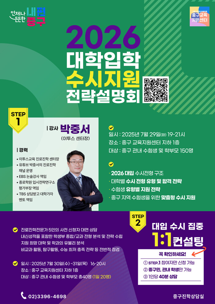 구는 이번 설명회와 컨설팅을 통해 수험생과 학부모의 입시 정보력과 전략 수립 능력을 향상시키고, 변화하는 대입제도에 능동적으로 대응할 수 있도록 지원해 진로 설계에 실질적인 도움이 될 것으로 기대하고 있다. 이번 프로그램과 관련한 자세한 사항은 중구청 교육정책과로 문의하면 된다.