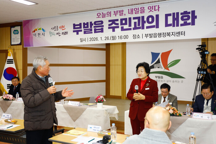 경기 이천시는 지난 26일 부발읍에서 김경희 시장 주재로 ‘부발읍 주민과의 대화’를 개최하고 주민과의 소통 행정을 이어갔다. 사진은 김 시장(오른쪽)이 주민과 대화하는 모습. (사진=이천시청 제공)