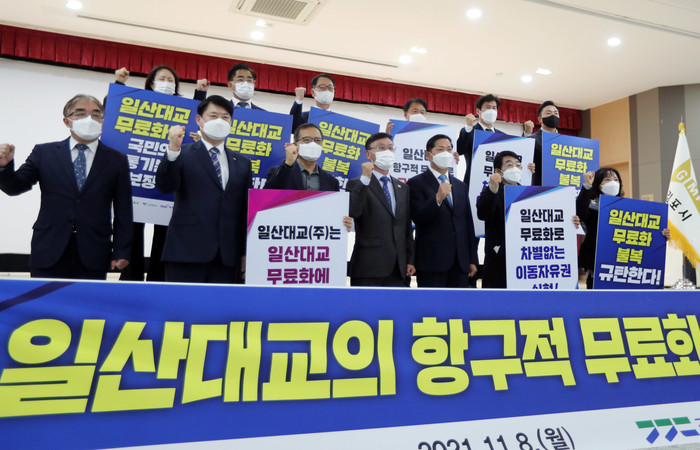 8일 오전 경기 김포시 사우동 김포시청에서 정하영 김포시장, 이재준 고양시장, 고광춘 파주시 부시장과 이한규 경기도 행정2부지사 등이 일산대교를 규탄하는 결의대회를 열고 있다