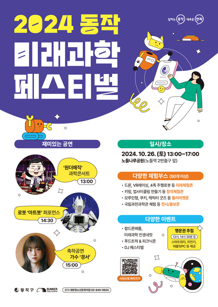 [시민일보 = 여영준 기자] 서울 동작구(구청장 박일하)는 오는 26일 노들나루공원(노량진로 247)에서 ‘2024 동작 미래과학 페스티벌’을 개최한다고 밝혔다.