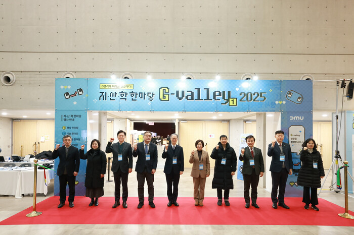 서울 구로구가 최근 강월명 구청 기획경제국장 및 김교일 동양미래대학교 총장, 지역내 기업인 등이 참석한 가운데 동양미래대학교에서 ‘제1회 G밸리 지·산·학 한마당’을 개최했다. 사진은 행사에서 관계자들이 기념촬영하는 모습. (사진=구로구청 제공)