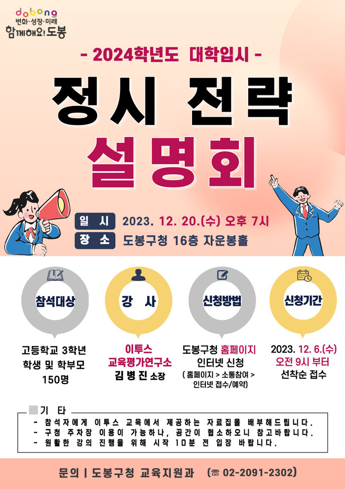 [시민일보 = 여영준 기자] 서울 도봉구(구청장 오언석)가 오는 20일 오후 7시 구청 16층 자운봉홀에서 수험생과 학부모들을 대상으로 2024학년도 대학입시 '정시 전략 설명회'를 개최한다.