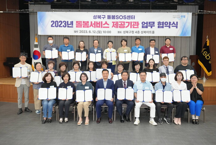 [시민일보 = 홍덕표 기자] 성북구(구청장 이승로)는 최근 구청 4층 성북아트홀에서 '2023년 성북형 돌봄SOS센터 사업' 추진을 위해 올해 돌봄서비스 제공기관 30곳과 업무 협약을 체결했다고 14일 밝혔다.
