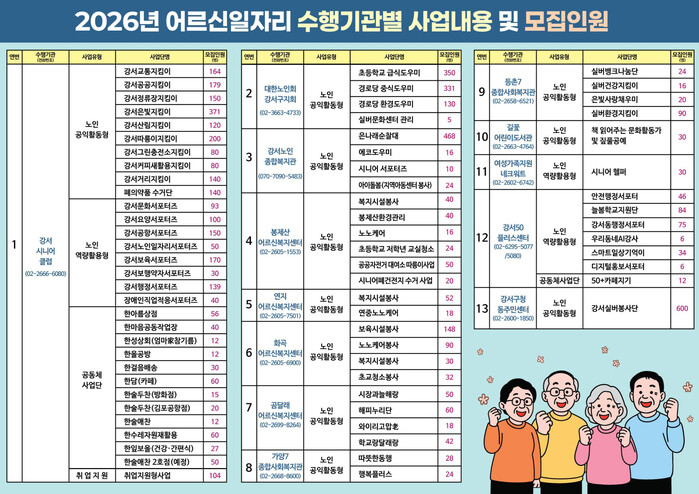 [시민일보 = 박소진 기자] 강서구(구청장 진교훈)가 ‘2026년 어르신일자리 및 사회활동 지원사업’ 참여자 6,083명을 오는 12일까지 모집한다.