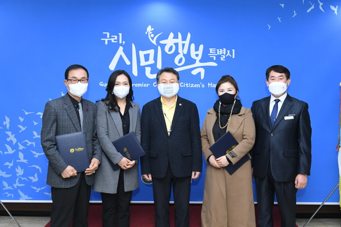 경기 구리시는 13일 성악가 최선주·홍지연씨와 대중가수 정종일씨를 홍보대사로 위촉했다. 홍보대사로 위촉된 이들은 임기 2년간 시 이미지 및 위상을 높이기 위한 국내·외 활동에 관한 사항 등의 역할을 담당하게 된다. 사진은 위촉식에서 안승남 시장(가운데)과 홍보대사들이 기념촬영을 하는 모습. (사진제공=구리시청)
