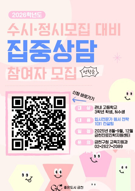 [시민일보 = 여영준 기자] 서울 금천구(구청장 유성훈)는 2026학년도 대학입시를 앞두고 오는 8월부터 수시모집 대비 1대1 집중상담에 들어간다고 밝혔다.