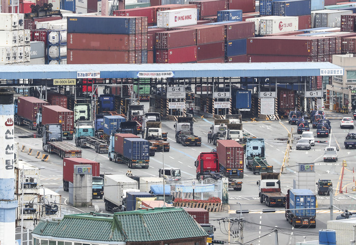 | ▲ 화물연대가 정부와의 협상 타결 후 업무에 복귀한 15일 오전 부산 신선대부두 앞 도로에서 컨테이너를 실은 화물차들로 분주한 모습을 보이고 있다. (사진제공=연합뉴스) |