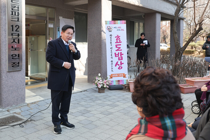박강수 서울 마포구청장은 최근 새롭게 문을 연 효도밥상 급식기관들을 방문하며 격려와 인사를 전했다. 사진은 상암월드컵파크12단지아파트경로당 효도밥상 급식기관 개소식에 방문한 박 구청장이 인사말을 하고 있는 모습. (사진=마포구청 제공)