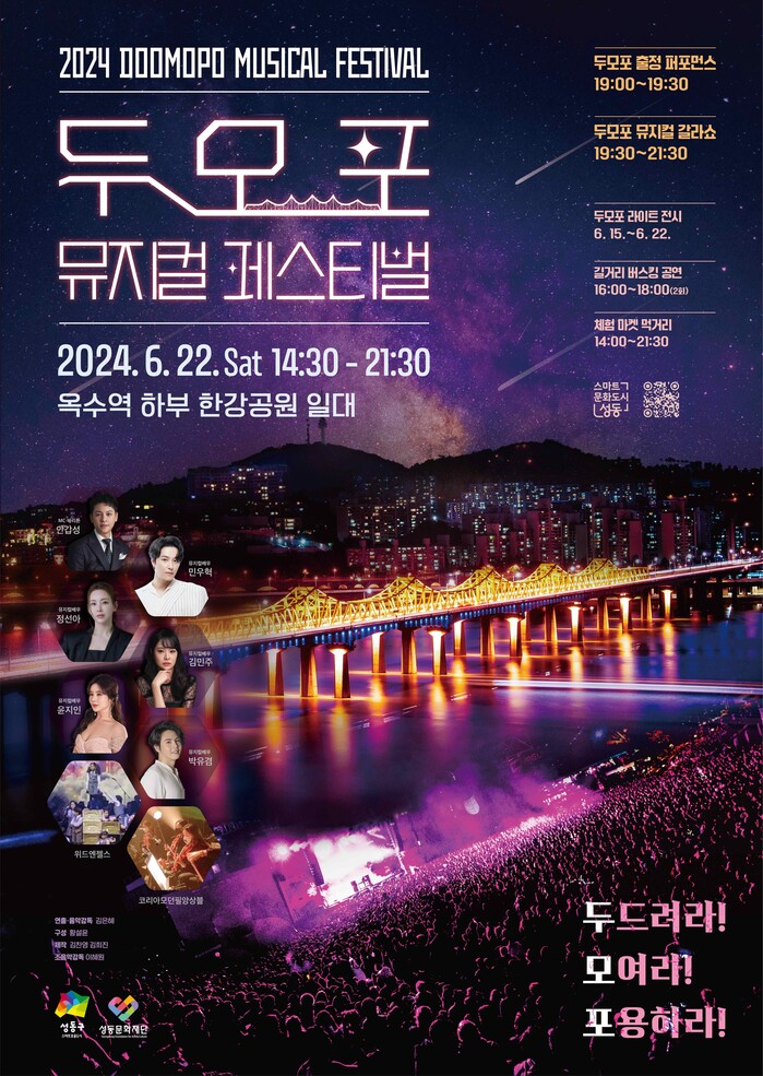 [시민일보 = 변은선 기자] 성동구(구청장 정원오)가 오는 22일 옥수역 한강공원에서 구민과 함께 화합과 포용의 메시지를 전하는 한여름 밤의 뮤지컬 페스티벌 ‘2024 두모포 뮤지컬 페스티벌’을 개최한다.