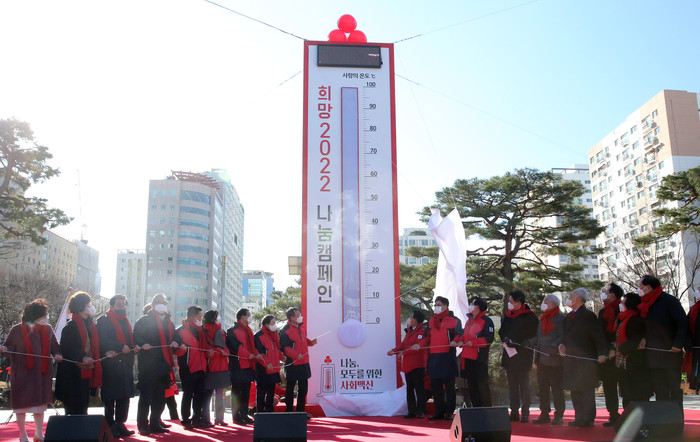 인천사회복지공동모금회는 1일 인천시청 앞 광장인 '인천애뜰'에서 사랑의 온도탑을 제막하고 '희망 2022 나눔캠페인'을 시작했다고 밝혔다. 사진은 제막식 모습.
