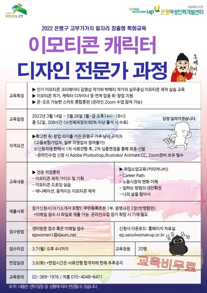 [시민일보 = 이대우 기자] 서울 은평구(구청장 김미경)가 취업지원교육 프로그램의 일환으로 ‘이모티콘 캐릭터 디자인 전문가 과정’ 교육생을 오는 3월7일까지 모집한다.