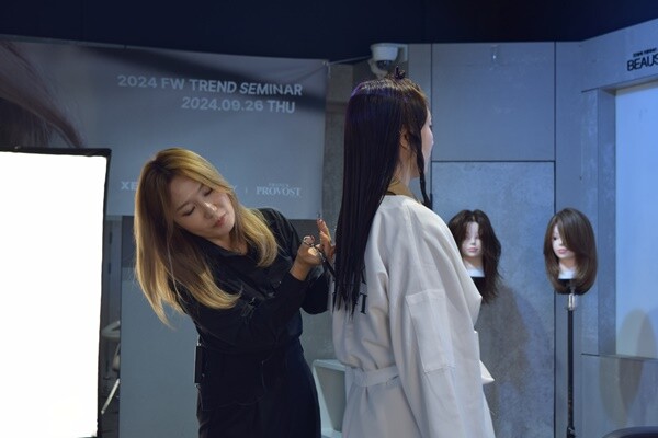세미나에서는 제오헤어&프랑크프로보 교육부 서지원 이사와 맹민지 강사가 2024 F/W 트렌드 헤어컷, 트렌드 테크니컬을 활용한 시연을 선보였다.