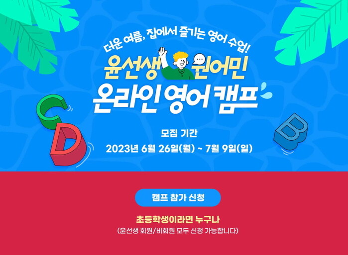 [시민일보 = 여영준 기자] 영어교육 전문기업 윤선생은 초등학생을 대상으로 ‘원어민 온라인 영어캠프’를 열고, 참가자를 모집한다고 26일 밝혔다.