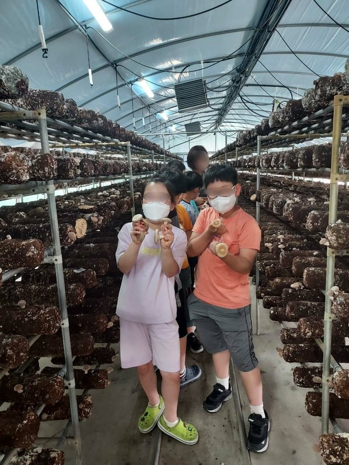 | ▲ 표고버섯 수확 체험을 하는 학생들 |