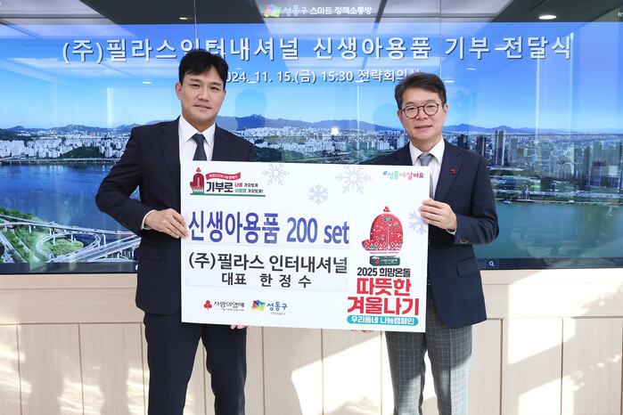 [시민일보 = 박소진 기자] 성동구(구청장 정원오)가 최근 ㈜필라스인터내셔널과 신생아 용품 200세트 기부 전달식을 가졌다고 25일 밝혔다.