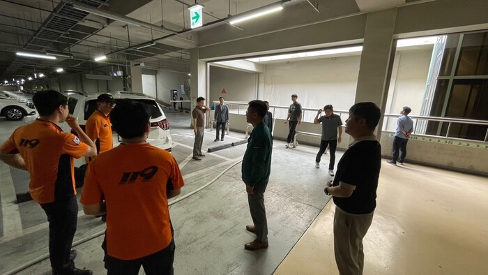 송파소방서와 합동으로 실시한 이번 소방훈련은 삼전동공영주차장과 송파동 공영주차장에서 진행되었으며 전기차 화재 발생 시 대응방법 훈련, 화재 경보 발령을 통한 대피 훈련, 소화기 및 옥내 소화전 사용법, 비상시 인명대피 및 인명구조 훈련, 자위소방대 화재진화 훈련 등을 실시하였다.