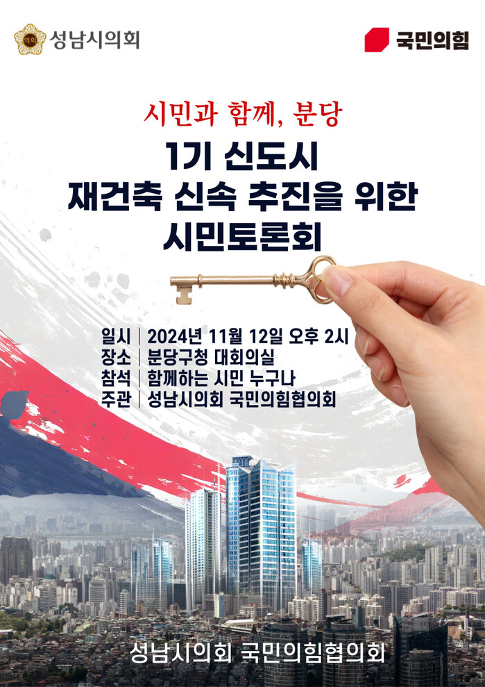 이번 토론회는 분당구 최대 현안인 1기 신도시 재건축 사업을 직접 챙기며 22대 국회에서 ‘재건축 하이패스 법안’을 발의했던 김은혜 국회의원(경기 성남시 분당구을)을 비롯하여 성남시의회 이덕수 의장, 분당구 지역 주민 200여 명, 관계전문가, 성남시의회 국민의힘협의회 시의원 등 함께 참여하여 실현 가능한 재건축 신속 추진 방안에 대해 열띤 토론을 펼칠 예정이다.