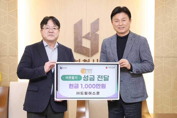 (주)드림아스콘이 13일 경기 부천시에게 취약계층 지원을 위한 이웃돕기 성금 1000만원을 전달했다. 사진은 기부금 전달식에 참석한 조용익 시장(오른쪽)이 서정윤 (주)드림아스콘 대표이사와 기념 촬영을 하는 모습. (사진=부천시청 제공)