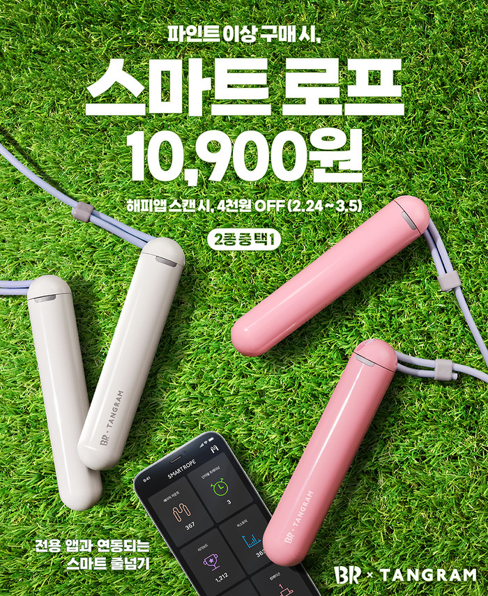배스킨라빈스는 ‘스마트 로프’ 굿즈 출시를 기념해 다양한 프로모션을 실시한다. 우선, 24일부터 파인트(8,900원) 사이즈 이상 구매 시 스마트 로프를 10,900원에 판매하며, 3월 5일까지 해피포인트 애플리케이션(이하 해피앱) 바코드를 스캔 후 결제하면 4천원의 가격 혜택을 제공해 6,900원에 구매할 수 있다. (단, 굿즈 소진 시 행사는 자동 종료)