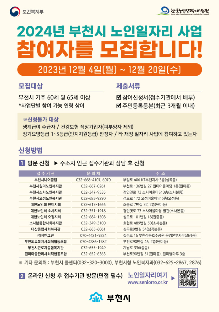 [부천=문찬식 기자] 경기 부천시가 오는 12월4일부터 20일까지 노인일자리사업 참여자 6440명을 모집한다고 밝혔다.