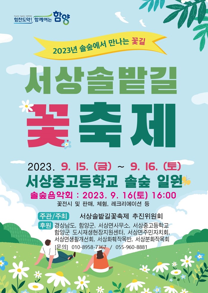 농촌마을 작은축제의 일환으로 올해 처음 개최되는 ‘서상솔밭길꽃축제’는 꽃 전시 및 판매, 각종 체험, 레크리에이션, 솔숲음악회 등 작지만 알찬 체험형 축제로 방문객들에게 즐거운 추억을 남길 수 있도록 꾸며졌다.