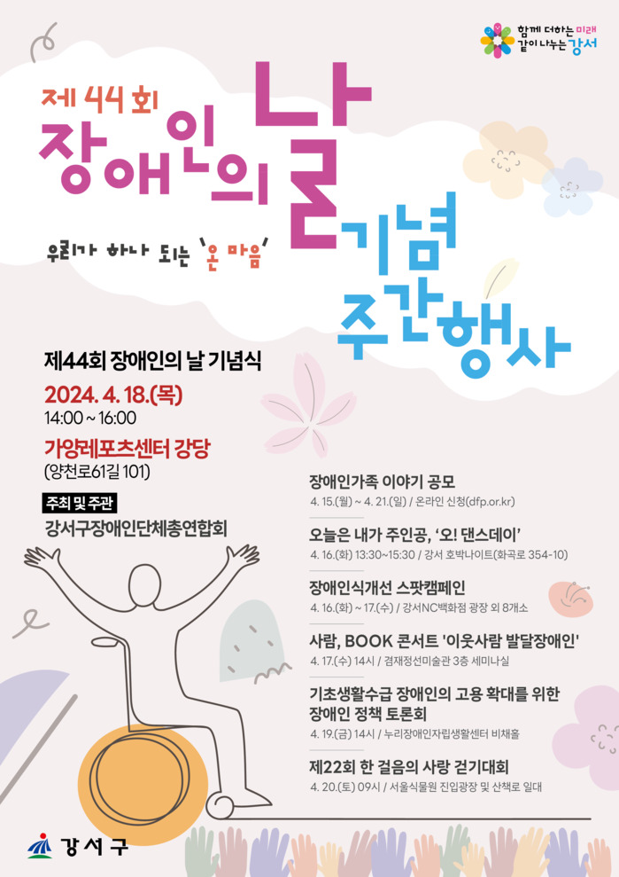 [시민일보 = 이대우 기자] 서울 강서구(구청장 진교훈)가 오는 20일 44번째 장애인의 날을 기념해 장애인과 비장애인의 벽을 허무는 특별한 한 주를 마련했다.