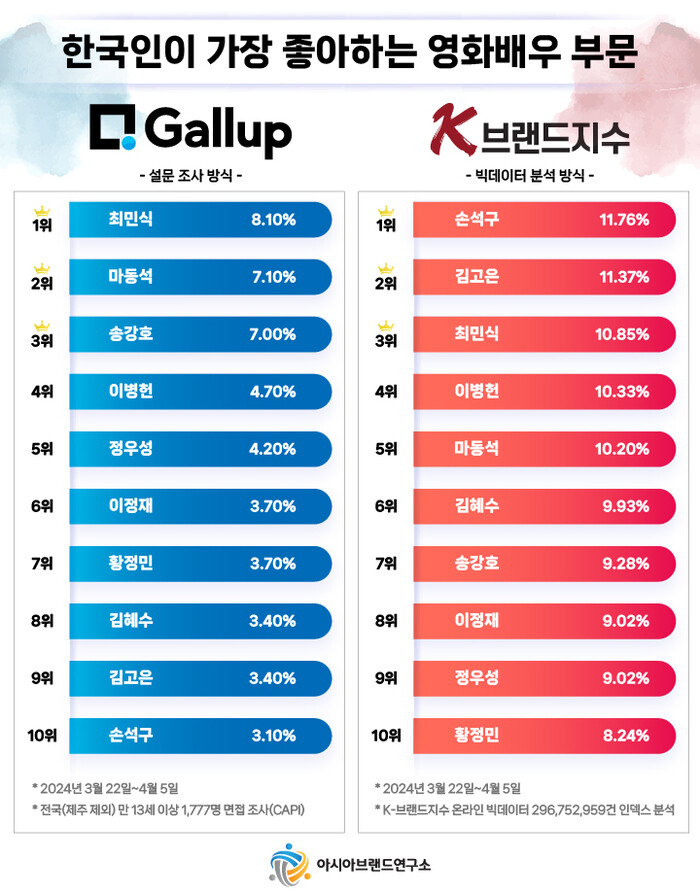 아시아브랜드연구소 한정근 대표는 "한국갤럽이 발표한 대중문화 각 부문별 선호도 설문 조사 결과의 의구심 해소 차원에서 본 연구소는 자체 개발한 K-브랜드지수 빅데이터 시스템을 통해 해당 선호도 순위의 재조사를 실시했다. 한국갤럽의 설문 조사와 동일한 기간으로 설정해 빅데이터를 분석한 결과 6개 부문 중 3개의 1위가 불일치했다“고 설명했다.