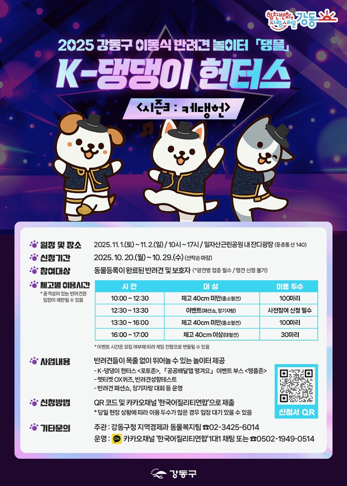 ‘댕플(시즌3: 케댕헌)‘ 참여를 원하는 보호자는 20일 오전 9시부터 구청 홈페이지 ‘댕플’큐알(QR)코드나 카카오채널 ‘한국어질리티연합’을 통해 사전 신청할 수 있다. 접수는 선착순 마감되며, 자세한 사항은 강동구청 홈페이지를 통해 확인하거나 지역경제과로 문의하면 된다.