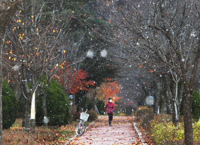 절기상 소설인 22일 오전 경기도 수원시 권선구 일월공원에 눈이 내리고 있다.