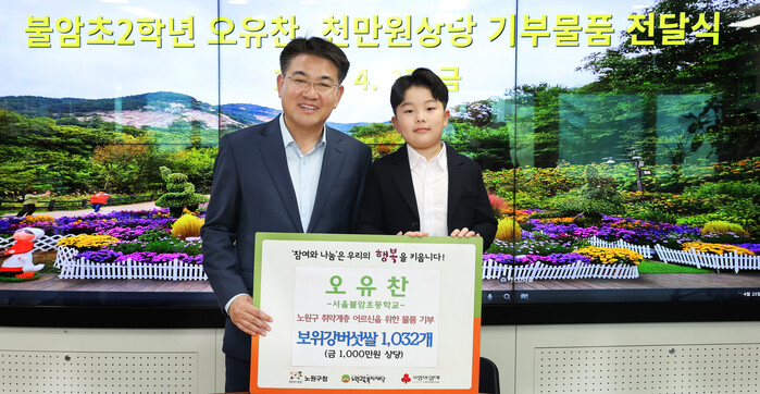 [시민일보 = 박소진 기자] 오승록 서울 노원구청장이 최근 구청장실에서 열린 서울불암초등학교 2학년 오유찬군의 후원물품 기부 전달식에 참석해 감사의 뜻을 전했다고 28일 밝혔다.