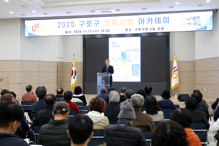 서울 구로구가 지난 12일 구청 강당에서 ‘2025 구로구 정비사업 아카데미’ 마지막 회차를 끝으로 총 420여명이 참석한 가운데 성황리에 마무리했다. 사진은 아카데미에서 장인홍 구청장이 인사말을 하는 모습. (사진=구로구청 제공)