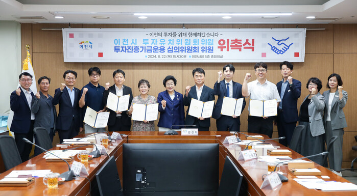 경기 이천시는 22일 투자유치에 관한 중요 시책 등 이천시 기업투자 유치를 위해 함께할 이천시 ‘투자유치위원회’와 ‘투자유치진흥기금 운용심의위원회’의 위촉식을 했다. 사진은 위촉식에서 김경희 시장(가운데)과 관계자들이 기념촬영을 하고 있는 모습.(사진=이천시청 제공)