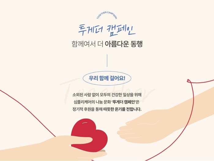 심플리케어와 함께한 투게더 캠페인의 첫걸음은 취약계층 노인복지관 물품 후원으로, 건강 관리에 소홀해지기 쉬운 어르신들을 위해 1억원 상당의 제품을 후원했다.