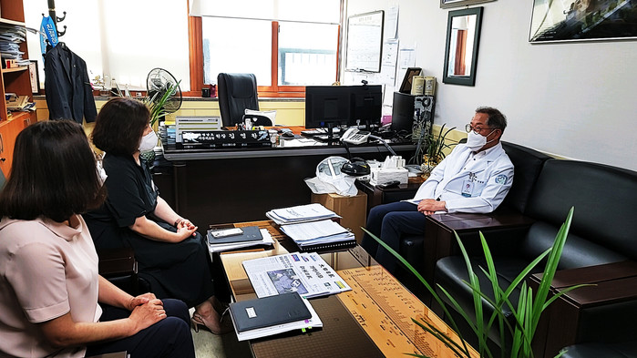 | ▲ 구 관계자와 병원 관계자가 코로나19 원스톱 진료기관 확대와 관련해 간담회를 진행하고 있는 모습. (사진제공=서산시청) |