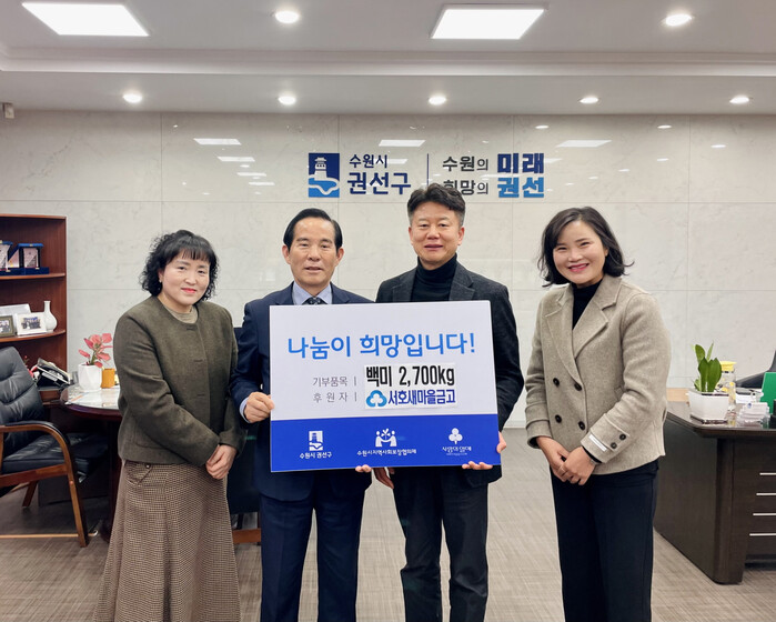 경기 수원시 권선구가 13일 서호새마을금고에서 설맞이 ‘사랑의 좀도리쌀’ 258포 후원 전달식을 열었다. 사진은 전달식에 참석한 김종석 구청장(오른쪽 두 번째) 및 참석자들이 기념촬영을 하고 있는 모습. (사진=권선구청 제공)
