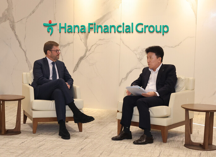 | ▲ 함영주 회장(사진 오른쪽)과 존 코노턴(John Connaughton) 베인캐피탈 글로벌 CEO(사진 왼쪽)가 국내 투자 확대 전략에 대한 의견을 나누고 있다. (사진=하나금융그룹 제공) |