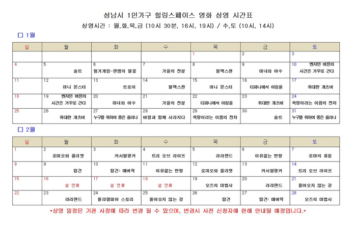 | ▲ 여성가족과-성남시 1인가구 힐링스페이스 1~2월 영화 상영 시간표. |